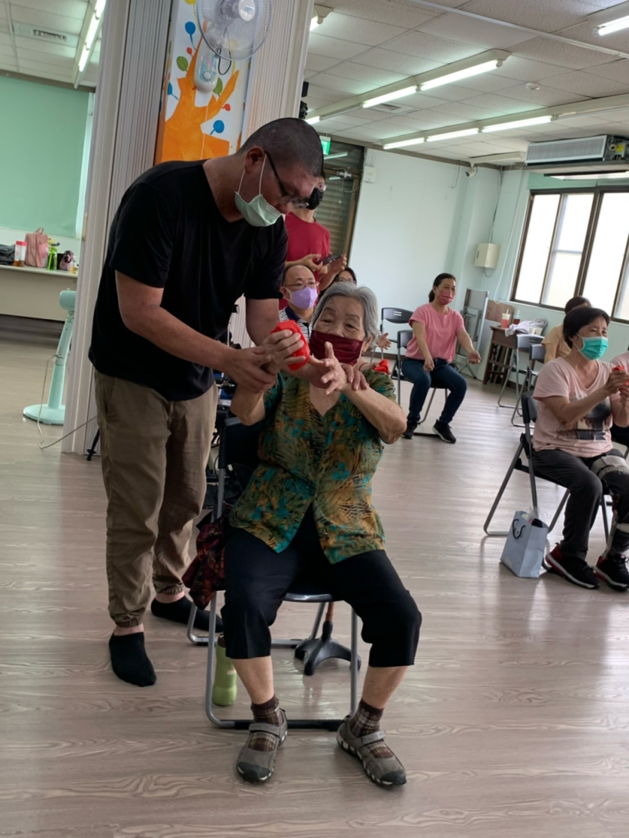 體適能運動教練鄭雅瓊以活潑的教課方式,讓長輩及身心障礙學員在歡笑中快樂、輕鬆自在運動著自己的身體。鄭雅瓊教練更引導受處人社區志工融入參與,擔任助教角色,分別在台上動作示範、台下陪伴指導長輩及身心障礙學員伸展動作。現場歡笑聲此起彼落,氣氛融洽熱絡。
